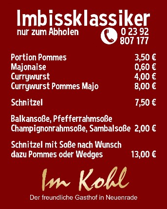 Im Herzen von Neuenrade befindet sich der historische Gasthof Im Kohl. Die waldreiche Umgebung der Stadt bietet umfangreiche Möglichkeiten zum Wandern sowie im Winter eine Skipiste mit Lift und eine Langlaufloipe. In nur wenigen Minuten erreichen Sie von hier aus die Städte Balve mit der größten Kulturhöhle Europas, Altena mit der mittelalterlichen Burg, Werdohl und Plettenberg sowie den Sorpesee, der zu sportlicher Betätigung zu Lande und im Wasser einlädt.